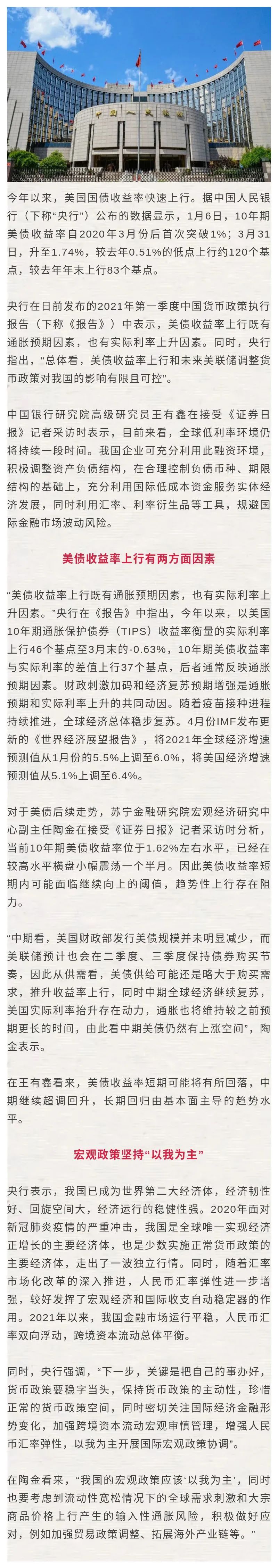 央行:美债收益率上行对我国影响有限且可控 专家建议政策面坚持“以我为主”
