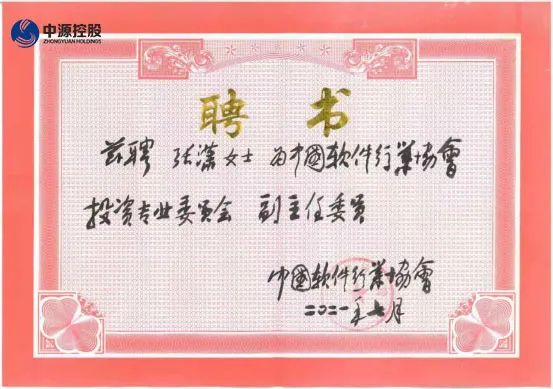 2021年7月,中国软件行业协会正式聘请中源控股总裁张潇女士为投资专业委员会副主任委员!