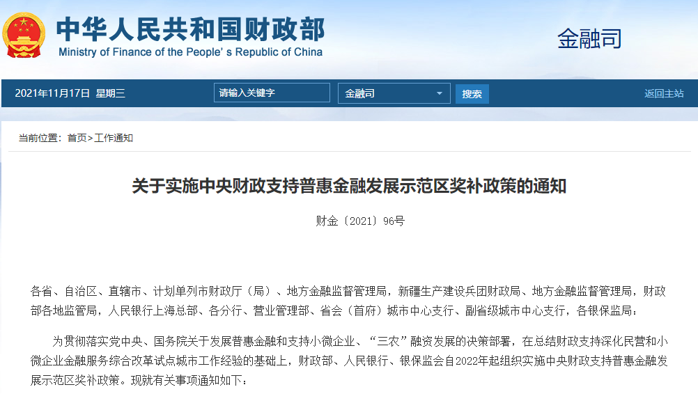 中源控股关注到,近日,财政部、人民银行、银保监会联合印发《关于实施中央财政支持普惠金融发展示范区奖补政策的通知》(下称《通知》),决定在总结财政支持深化民营和小微企业金融服务综合改革试点城市奖补政策经验的基础上,自2022年起实施中央财政支持普惠金融发展示范区奖补政策。