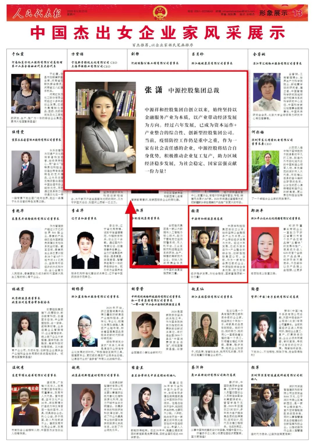 中源控股集团总裁张潇作为中国杰出女企业家代表,荣登两会专刊《人民代表报》